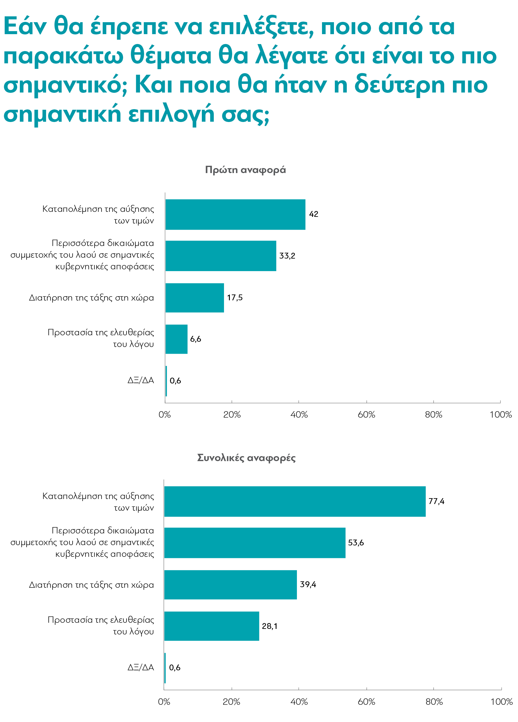 Ένας ακόμη έντονος προβληματισμός του πληθυσμού, ο οποίος ανακύπτει με μια ματιά στα αποτελέσματα, αφορά το κόστος ζωής. Σχεδόν 8 στους 10 (77,4%) δηλώνουν ότι, μεταξύ κάποιων επιλογών που δίνει το ερωτηματολόγιο, το πιο σημαντικό θέμα είναι η καταπολέμηση της αύξησης των τιμών. Μάλιστα, αρκετά αργότερα, μια πολύ σημαντική πλειοψηφία δηλώνει ότι θα μπορούσε να συμμετάσχει ή έχει συμμετάσχει ήδη σε μποϊκοτάζ (που, ωστόσο, μπορεί να μην έχει μόνο οικονομικά κίνητρα, π.χ. να αφορά προϊόντα μιας χώρας που εμπλέκεται σε πολέμους). [Ε18, Ε51]