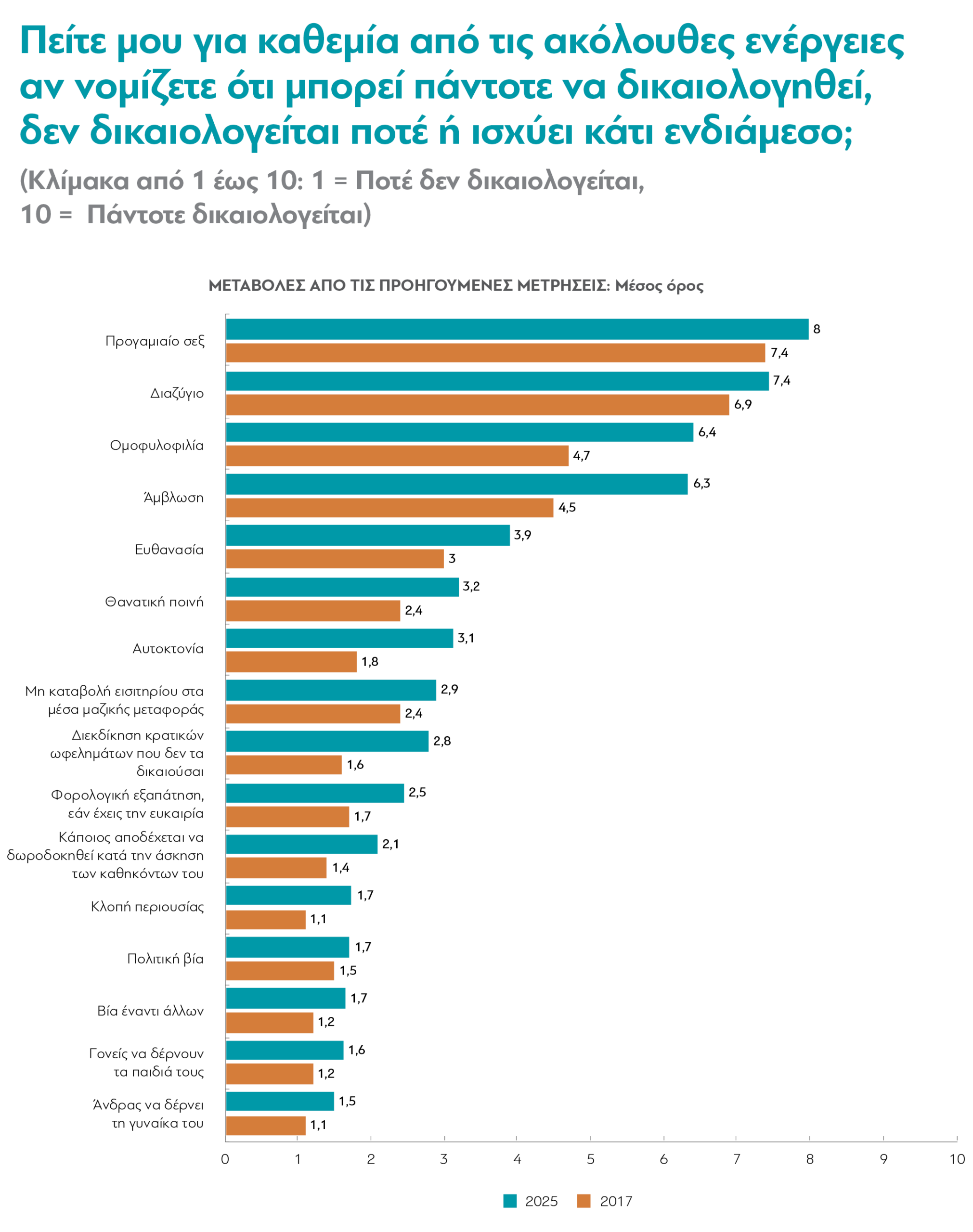 Επιπλέον, η έρευνα, σε μια πολύ έξυπνη ενότητα (ερ. 45), ρωτάει τους συμμετέχοντες κατά πόσο θεωρούν ότι δικαιολογούνται μια σειρά από 16 πολύ διαφορετικές μεταξύ τους ενέργειες, οι οποίες σε πολλές κοινωνίες ανά τον κόσμο συνοδεύονται από στερεότυπα και προκαλούν πόλωση, ή αποτελούν και παράνομες, κατακριτέες, σημαντικές ή ασήμαντες, πράξεις. Η ελληνική κοινωνία εμφανίζεται, κατά μέσο όρο, σαφώς υποστηρικτική προς το προγαμιαίο σεξ (μ.ό. βαθμολογίας 8 στα 10), το διαζύγιο (7,4), την ομοφυλοφιλία (6,4) και την άμβλωση (6,3) – και μάλιστα σε πολύ μεγαλύτερο βαθμό απ’ ό,τι το 2017, ειδικά όσον αφορά την ομοφυλοφιλία και την άμβλωση. Οι υπόλοιπες επιλογές συγκεντρώνουν μέσο όρο χαμηλότερο του 5, άρα τείνουν προς το να μη δικαιολογούνται: ευθανασία (3,9), θανατική ποινή (3,2), αυτοκτονία (3,1), μη καταβολή εισιτηρίου στα μέσα μεταφοράς (2,9), διεκδίκηση κρατικών επιδομάτων που δεν δικαιούνται (2,8), φορολογική εξαπάτηση (2,5), αποδοχή δωροδοκίας (2,1), κλοπή περιουσίας (1,7), πολιτική βία (1,7), βία έναντι άλλων (1,7), γονείς να δέρνουν τα παιδιά τους (1,6), και άνδρας να δέρνει τη γυναίκα του (1,5). [Ε45]