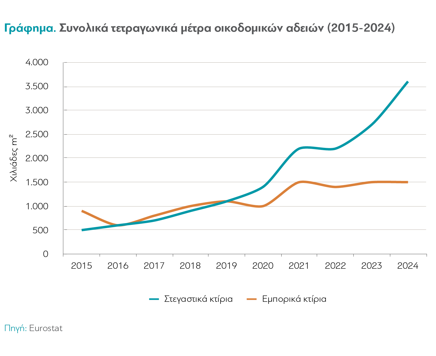 Από την άλλη πλευρά, η προσφορά κατοικιών δεν φαίνεται να ικανοποιεί τη ζήτηση. Τα στοιχεία δείχνουν μεν ότι η οικοδομική δραστηριότητα ανέκαμψε: Από το 2019 και μετά, οι οικοδομικές άδειες για κατοικίες είναι σταθερά συγκριτικά περισσότερες από ό,τι στο παρελθόν, περίπου 70% του συνόλου (2024). Ωστόσο, χωρίς επιπλέον στοιχεία για κρίσιμα χαρακτηριστικά των νέων αδειών (π.χ. για την τοποθεσία), είναι αρκετά δύσκολο κάποιος να εκτιμήσει την πιθανή επίδρασή τους στις τιμές.