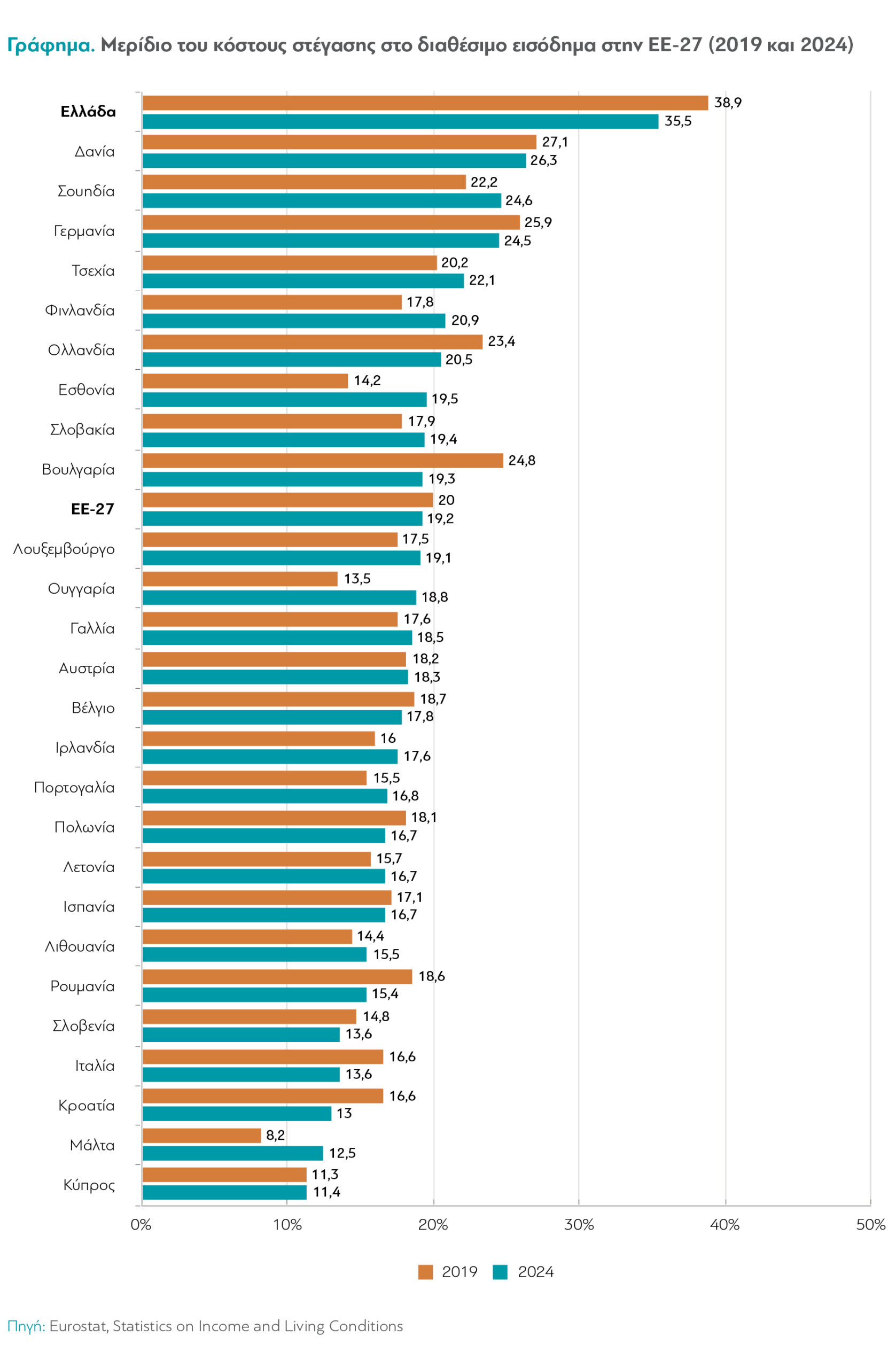 Τα ελληνικά νοικοκυριά δαπανούν πλέον πολύ μεγάλο μέρος του εισοδήματός τους για τη στέγαση, και αυτό φαίνεται σε μια σειρά από δείκτες. Το κόστος στέγασης, όπως το μετράει η Eurostat, περιλαμβάνει ενοίκια, δόσεις στεγαστικών δανείων, φόρους ακίνητης περιουσίας και έξοδα ενέργειας και άλλων λογαριασμών. Κατά την περίοδο 2010-2024, ως ποσοστό του εισοδήματος των νοικοκυριών, το κόστος στέγασης ξεπερνούσε σταθερά τον μέσο όρο της Ευρωπαϊκής Ένωσης: Το 2024, τα ελληνικά νοικοκυριά διέθεσαν 35,5% του διαθέσιμου εισοδήματός τους για τη στέγαση, με τον ευρωπαϊκό μέσο όρο στο 19,2%. Όμως, και η κατεύθυνση αυτής της πορείας μοιάζει ανησυχητική: Από το 2019 έως το 2024, αντίθετα με ό,τι συνέβη στις περισσότερες ευρωπαϊκές χώρες, η προσιτότητα της στέγασης στην Ελλάδα μειώθηκε.