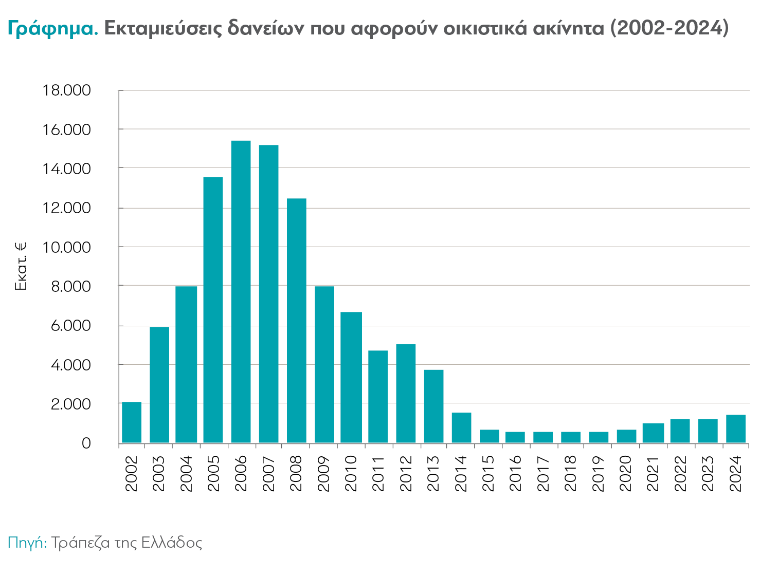 Οι ανισορροπίες γύρω από τη χρηματοδότηση επηρεάζουν έντονα την εικόνα της στέγασης στην Ελλάδα, τόσο από τη σκοπιά της ζήτησης όσο και της προσφοράς. Αφενός, οι τράπεζες χορηγούν πλέον πολύ λιγότερα στεγαστικά δάνεια σε σχέση με την περίοδο πριν από την κρίση. Το 2024, οι εκταμιεύσεις στεγαστικών δανείων έφτασαν περίπου τα 1,4 δισ. ευρώ. Το 2006, το αντίστοιχο ποσό ξεπερνούσε τα 15,5 δισ. ευρώ. Η μεγάλη αυτή διαφορά έχει σχέση τόσο με τις συνέπειες της μεγάλης κρίσης στην οικονομική πίστη των νοικοκυριών, όσο και με πιο αυστηρούς κανόνες των ίδιων των τραπεζών για τη δανειοδότηση. Σε κάθε περίπτωση, όμως, περιορίζει τη δυνατότητα των νοικοκυριών να αγοράσουν κατοικία. Επιπλέον, για την αντιμετώπιση της πληθωριστικής κρίσης, από το 2022 έως το τέλος του 2024, τα επιτόκια αυξήθηκαν σε όλη την Ευρωζώνη, και επομένως, ο δανεισμός έγινε ακριβότερος.