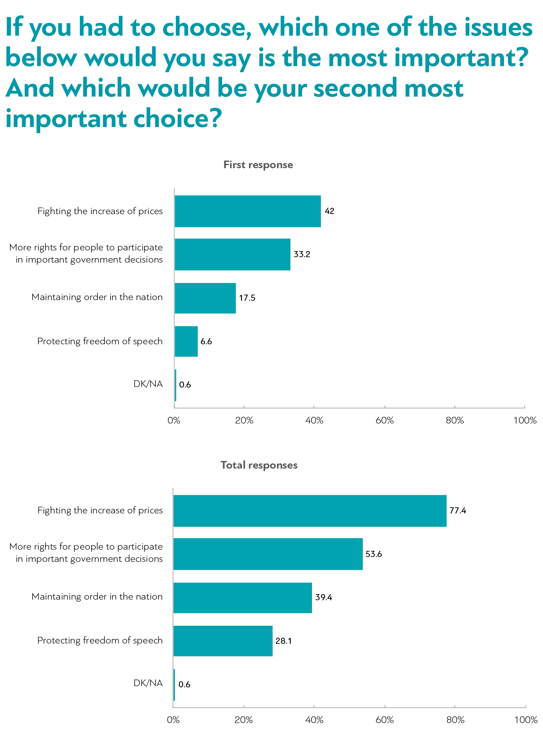 Cost of living is another acute concern that emerges from the findings. When presented with a broad list of options, nearly 8 out of 10 respondents (77.4%) identified the fight against price increases as the most pressing issue. This preference for economic activism is further reflected in a subsequent question where a significant majority say they would participate, or have already participated, in a boycott (an action that may not be driven solely by economic motivations, e.g. protesting products of a country involved in wars). [Q18, Q51]