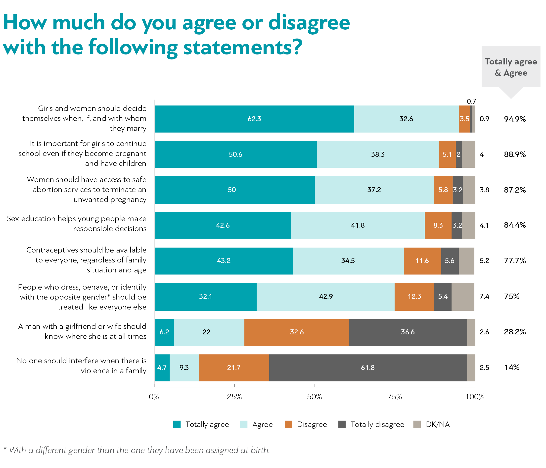 Regarding family and reproductive issues, Q47 offers an interesting perspective. It presents eight statements corresponding to positive or negative views on women’s roles in family planning and asks respondents to indicate their level of agreement. These include prompts such as: “Women should have access to safe abortion services to terminate an unwanted pregnancy” or “It is important for girls to continue school even if they become pregnant and have children.” The distribution of these responses is illustrated in the graph below. [Q47]