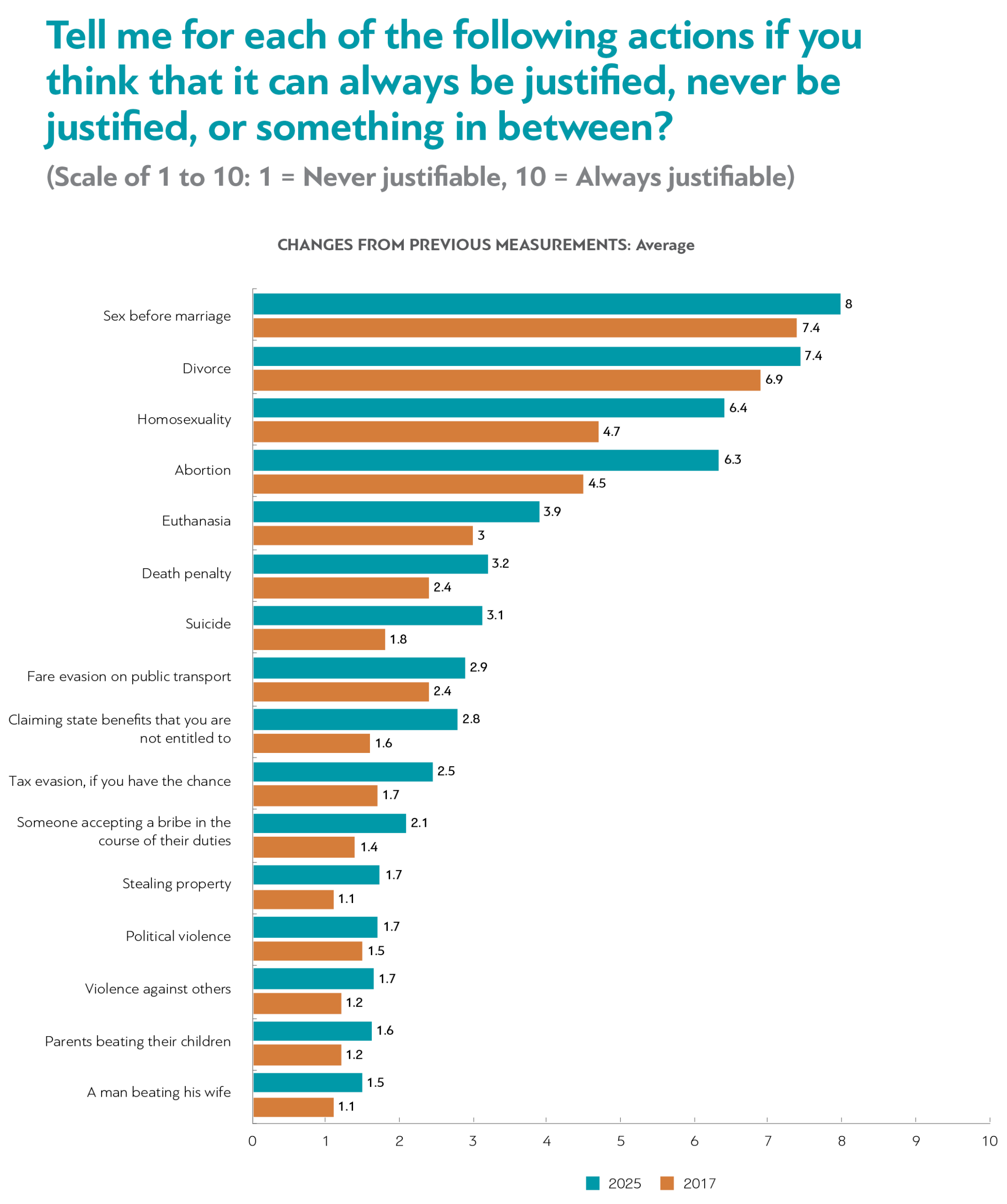 The survey includes a well-designed section where participants evaluate 16 actions that are often stereotyped or polarizing in many societies around the world, or which may variously be considered illegal, reprehensible, significant, or trivial. Greek society appears, on average, clearly supportive of premarital sex (average score of 8 out of 10), divorce (7.4), homosexuality (6.4), and abortion (6.3). Notably, acceptance of homosexuality and abortion has increased significantly since 2017. The remaining actions all received average scores below 5, indicating they are generally viewed as unjustifiable: euthanasia (3.9), the death penalty (3.2), suicide (3.1), fare evasion on public transport (2.9), claiming government benefits to which one is not entitled (2.8), tax evasion (2.5), accepting bribes (2.1), theft of property (1.7), political violence (1.7), violence against others (1.7), parents beating their children (1.6), and a man beating his wife (1.5). [Q45]
