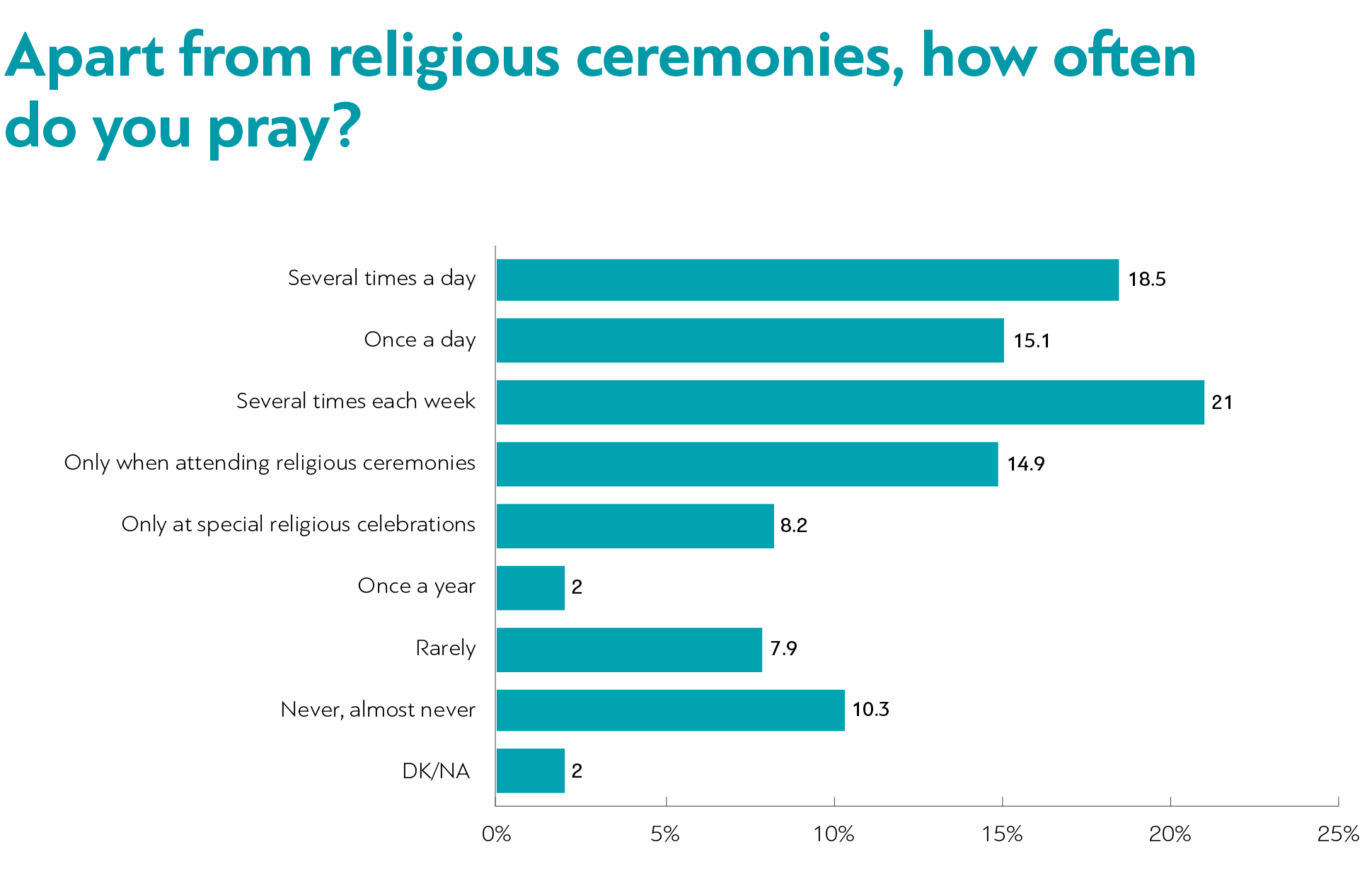 At the same time, the survey devotes considerable space to the population’s relationship with religion. Participants rate the importance of God in their lives at an average of 7 out of 10, down from an average of 8.1 in 2017. About 4 out of 10 state that they go to church only on special religious holidays, 2 out of 10 say that they go once a month, while almost 1 in 10 answers “never or almost never”. A small but clear majority of respondents (54.6%) say they pray on a regular basis, at least once a week, regardless of the holidays or ceremonies they attend. [Q39, Q41, Q42]
