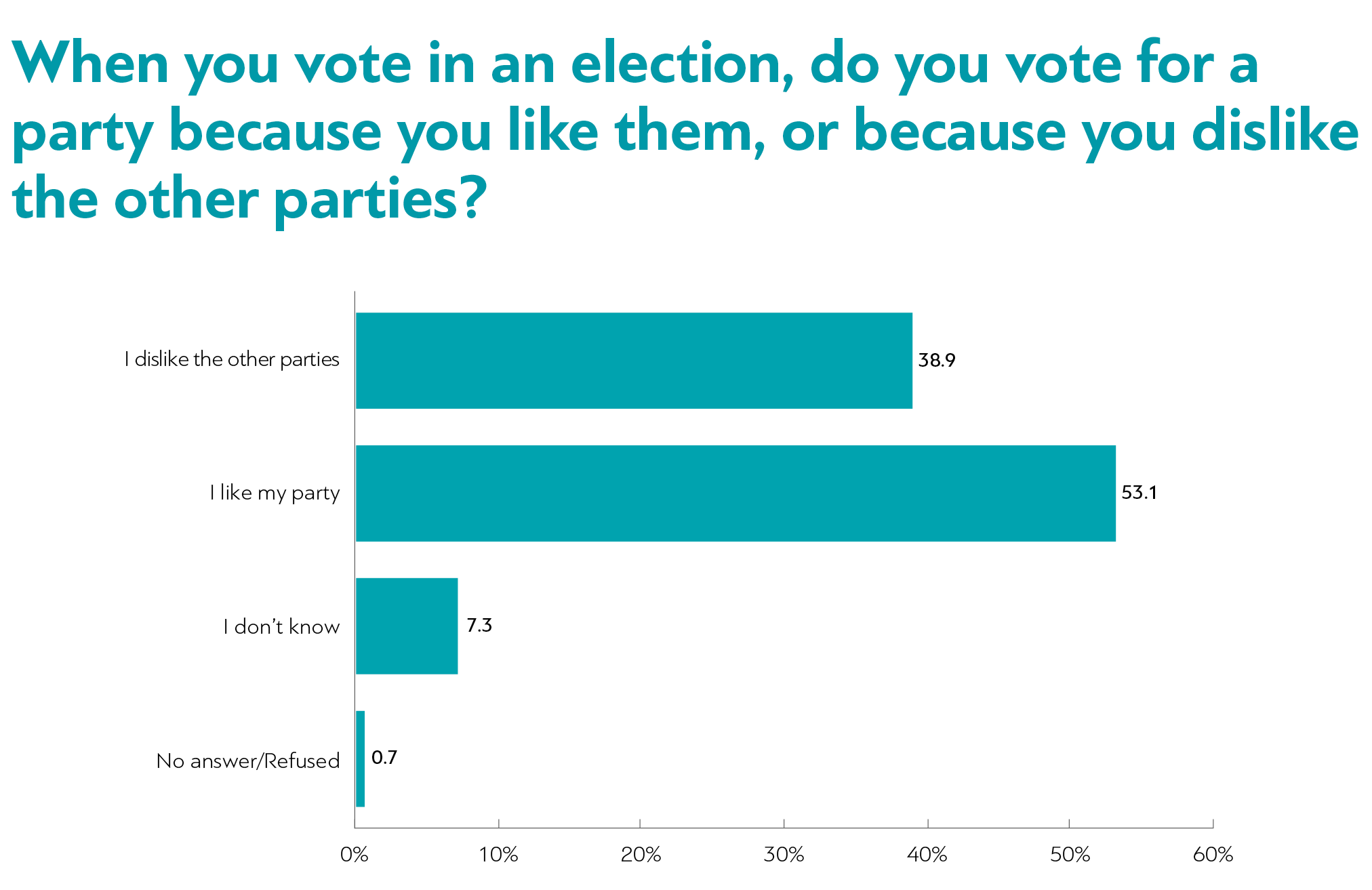 How do citizens decide at the ballot box? When asked, slightly more than half (53.1%) say they make their choice because of party identification. Nearly all the remainder—and that is not a small number, about 4 in 10—say they opt for a party because they dislike the alternatives. [Q53]