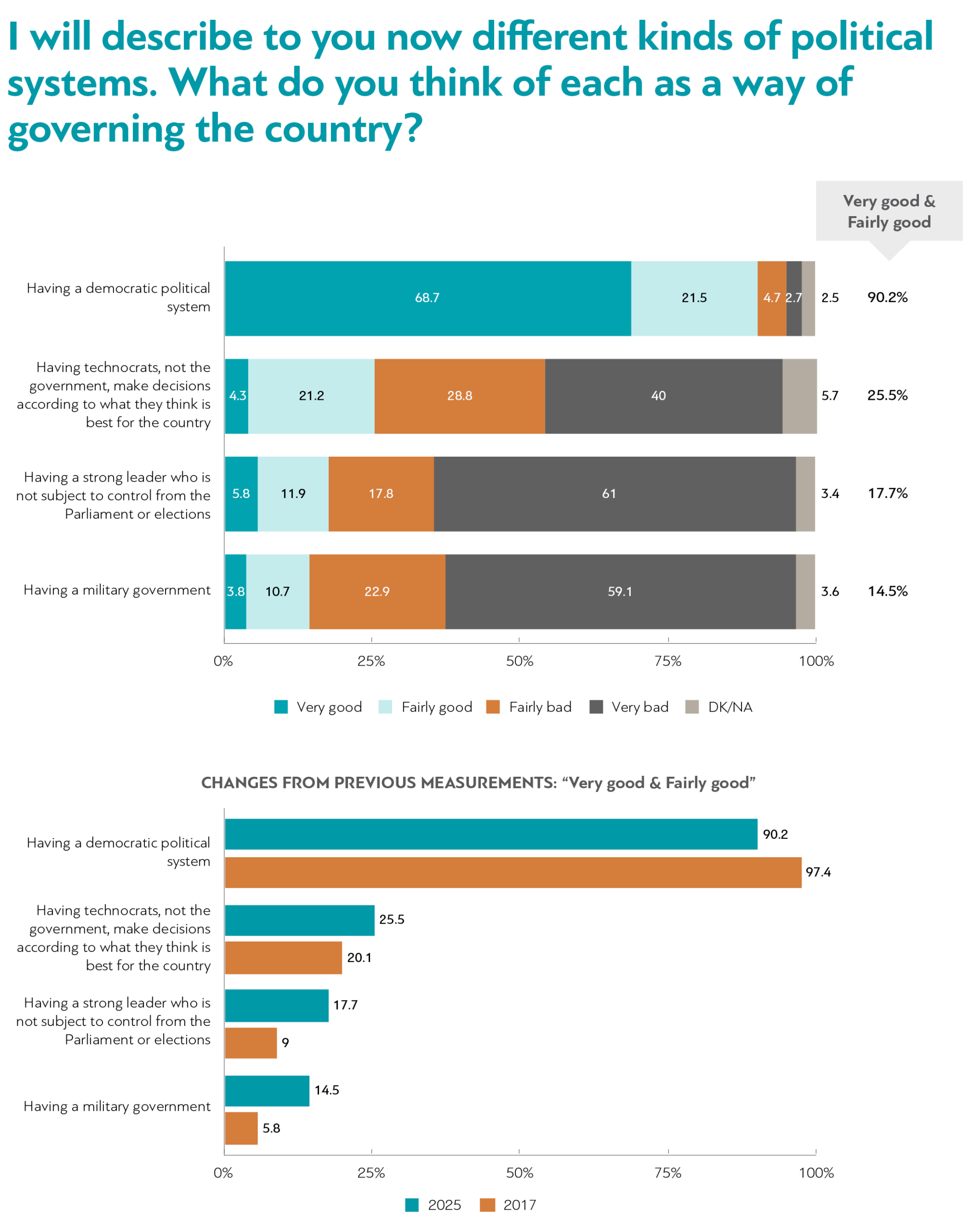 This distrust and concern among a significant portion of the population may not represent a wholesale rejection of democracy. Citizens clearly recognize the importance of living in a democratically governed country, rating it on average 8.8 out of 10 (10 = extremely important). Furthermore, 9 out of 10 say that democracy is a very good or relatively good way of governing. However, there is some cause for concern in the age-specific data. The approval rate among younger respondents (18–35 years old) is noticeably lower than the general population, at around 83%. And even the general population figure is already 7 points lower than in 2017. Taken together, this means today's young people are around 14 points less likely to consider democracy a good way of governing compared to the total population in 2017. [Q65, Q60]