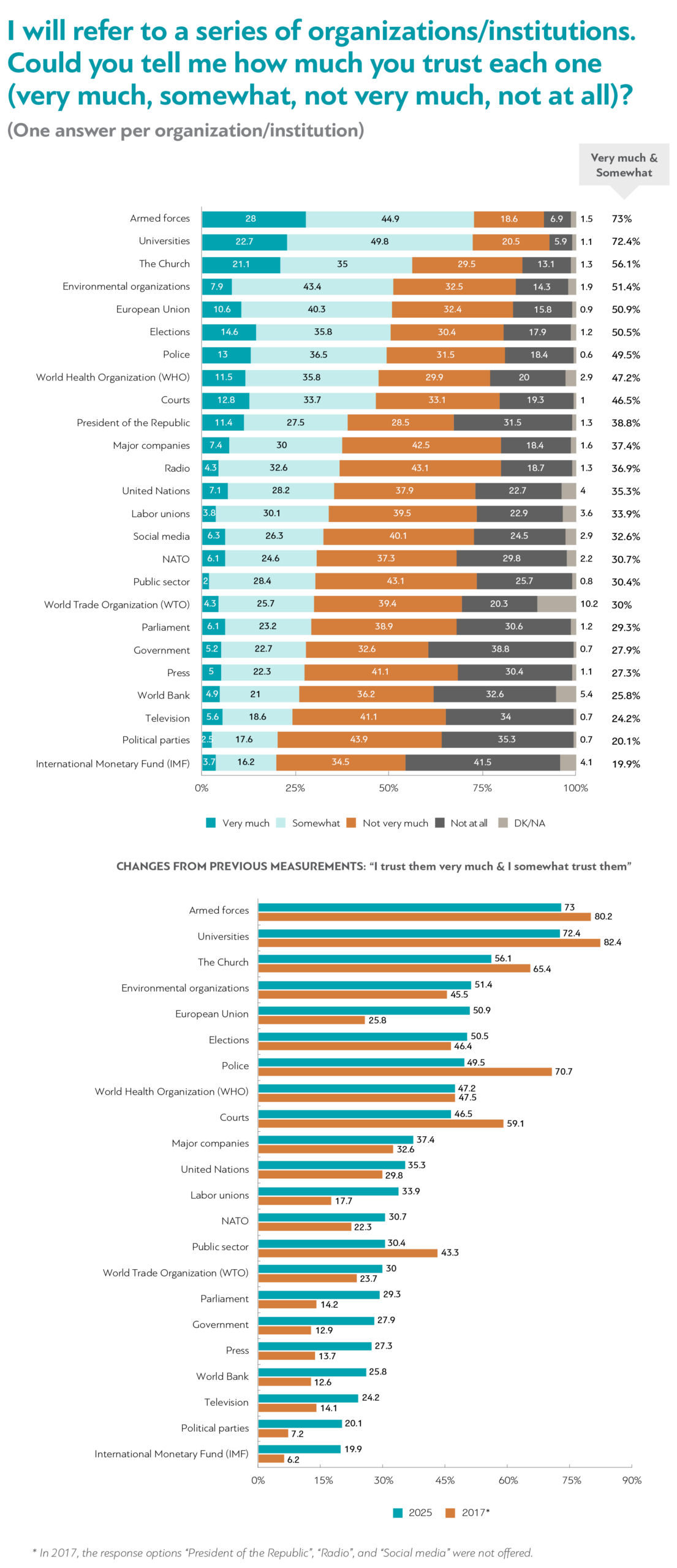 Of course, a democracy is not simply the elected government but a network of institutions, both national and international, each with its own distinctive characteristics. Questions exploring trust in institutions are common in surveys such as the World Values Survey and often yield interesting results. In this wave, the institutions that command the highest levels of trust remain similar to the 2017 wave as well as to similar surveys. At the top of the list are the military, universities, and the Church. They are followed by two less expected findings: environmental organizations rank fourth, and the European Union ranks fifth. The lowest rankings were given to the International Monetary Fund (IMF), political parties, television, the World Bank (though 5.4% say they do not know what it is) and the Press. Compared to the results of 2017, there are significant decreases in trust toward the military, universities, the Church, the police, the courts, and public administration. [Q14]