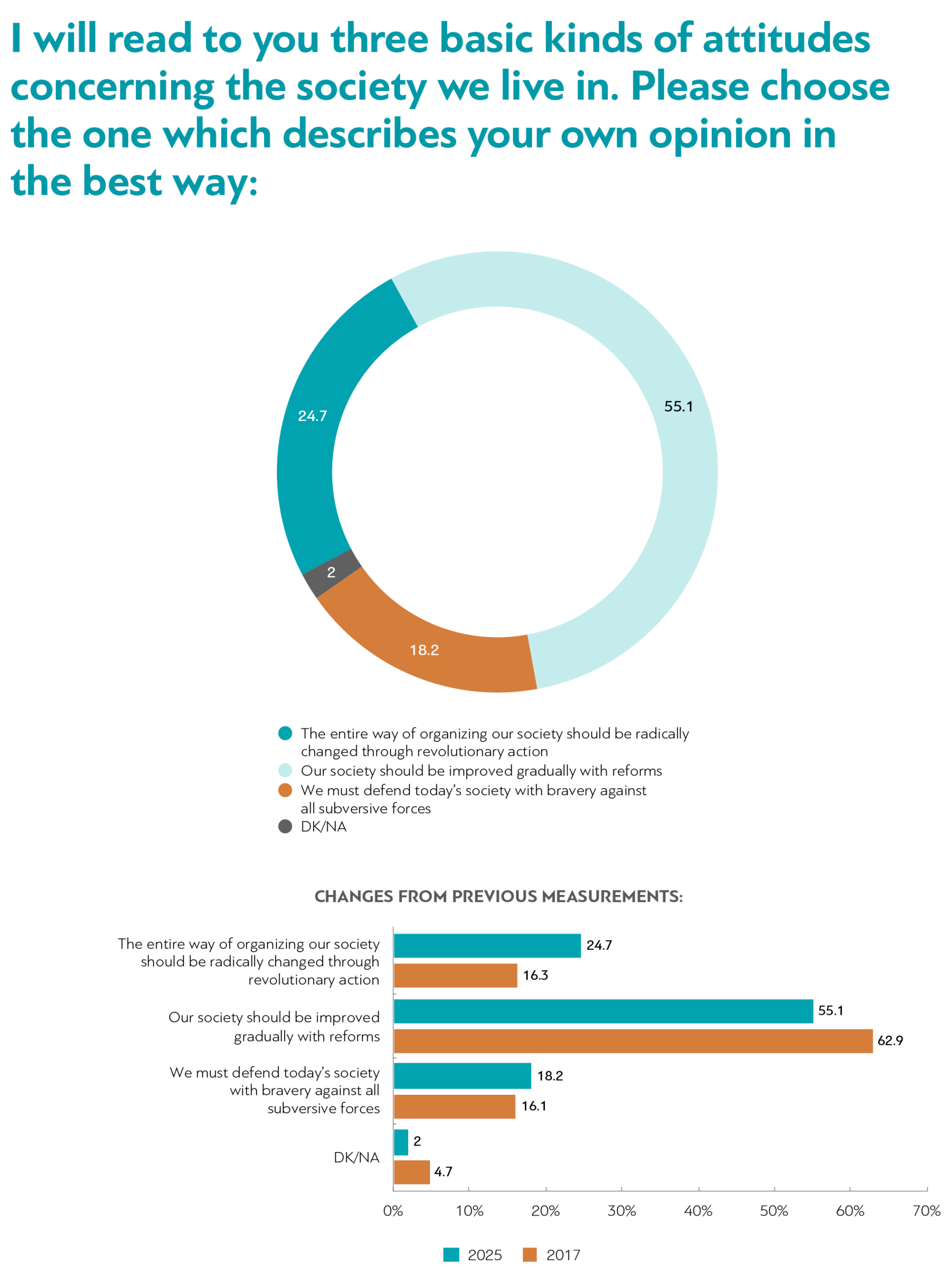 The survey also includes several ideological questions. Early in the survey, participants are asked to choose between three statements describing attitudes towards the society in which we live and whether and how it should change. A narrow majority (55%) agree that “our society should gradually improve through reforms,” while 24.7% respectively call for “revolutionary action” and 18.2% favor defending society against “all subversive forces.” While the majority is in favor of change through reforms, this support has declined significantly by 7.8 percentage points since 2017. Conversely, the other two options have gained ground: revolutionary action rose by 8.4 points, and the defensive stance increased by 2.1 points. [Q6]