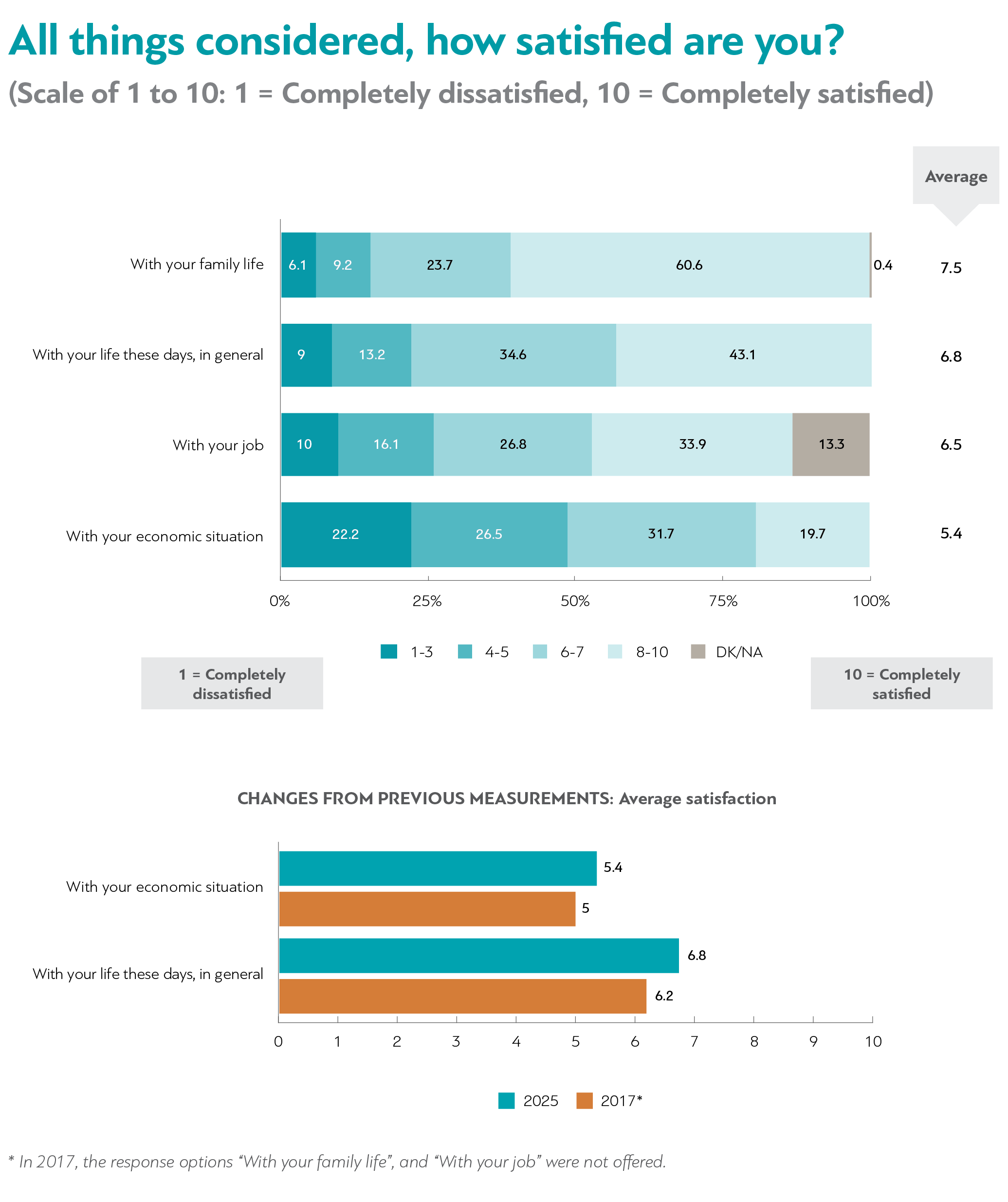 It is noteworthy that despite widespread disillusionment with politics, a significant majority (7 out of 10) say they feel very or fairly happy—a percentage similar to the 2017 results. An even larger share of the population (76.6%) describes their health as good or very good. Furthermore, 84.3% of respondents say they are satisfied or somewhat satisfied with their family life, giving it a rating of 6 out of 10 or higher. Within this group, 7 out of 10 rate their family life an 8 or above. Finally, around 8 out of 10 (82.7%) state that they often or sometimes reflect on the meaning of life. [Q8, Q9, Q11, Q44]