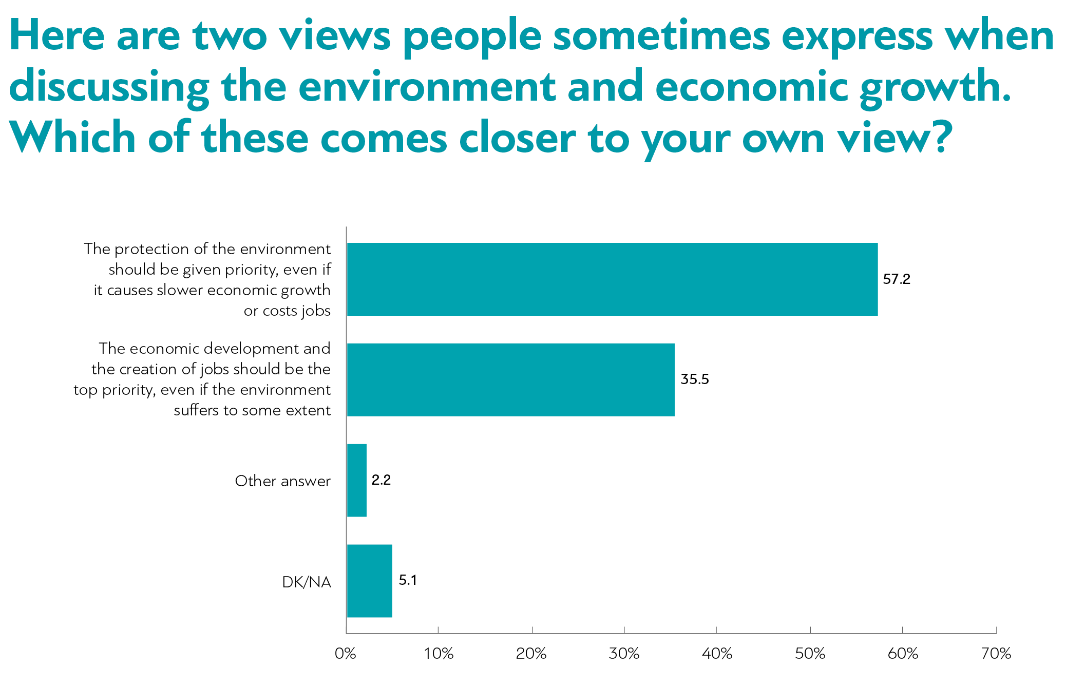 It is instructive to read the answers in combination with Question 38 that poses the dilemma between environmental protection and economic development. Interestingly, a majority of respondents (57.2%) say that protecting the environment should be a priority “even if it slows the pace of economic growth or costs jobs.” [Q38]