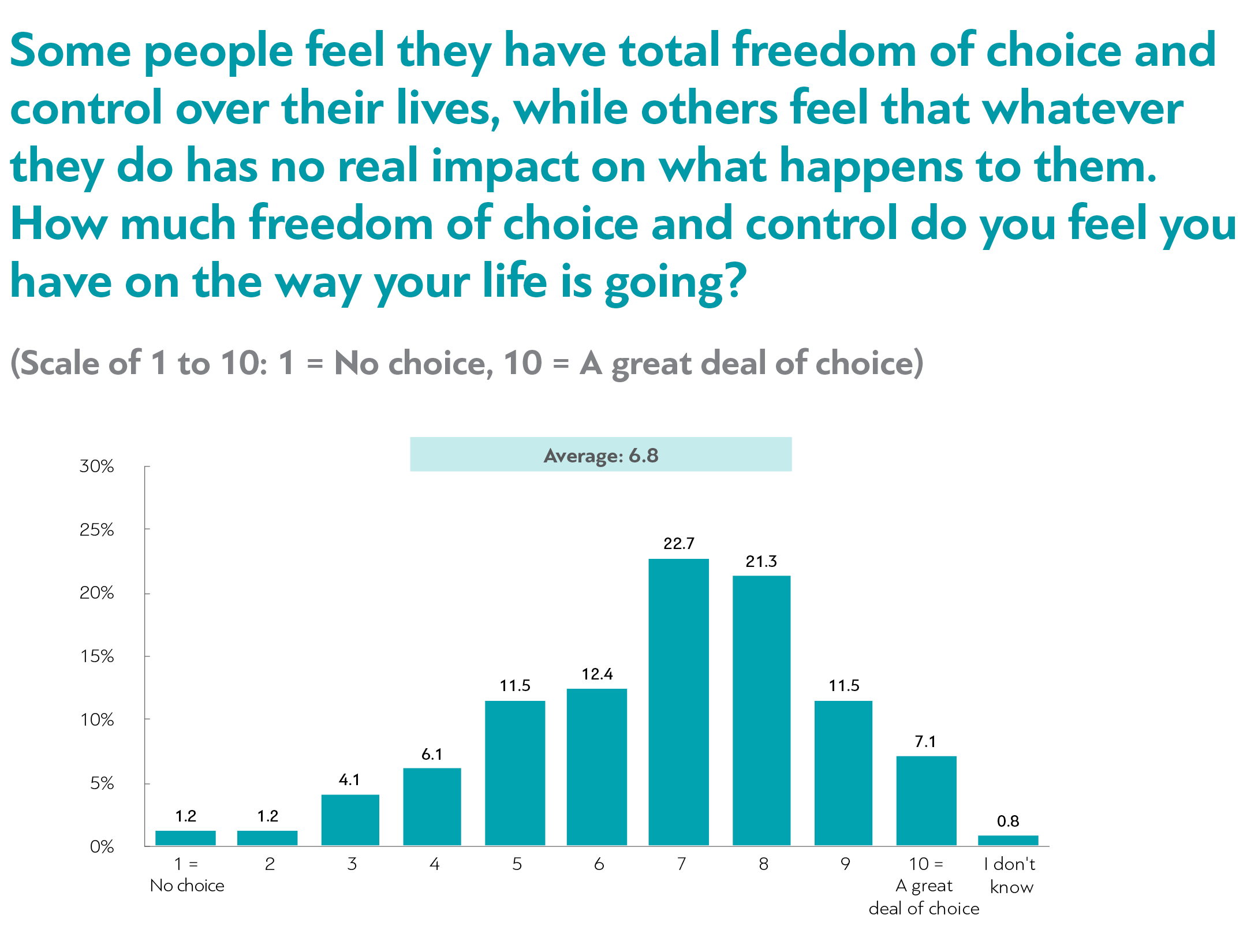 Do people feel in control of their lives? Question 10 explores “self-efficacy”—a popular concept among social scientists that refers to the degree to which individuals believe they have freedom of choice and control over their lives, as opposed to believing that their actions have little impact on their circumstances. Everyday life is complex, encompassing both circumstances within our control and those beyond it. One’s position on this spectrum is often linked to behaviors, decisions, and emotional states; indeed, many studies suggest that a greater feeling of control over life correlates with positive social, economic, and professional outcomes, as well as better mental health. From this perspective, it is significant that the Greek population, on average, rates their perceived level of control at 6.8 out of 10 (where 10 = a great deal of choice). This is a notable increase from the score of 6 recorded in 2017. Despite major external crises that emerged after 2017, such as the pandemic and cost-of-living crisis, Greeks clearly view themselves as having a significant degree of agency over their lives. [Q10]